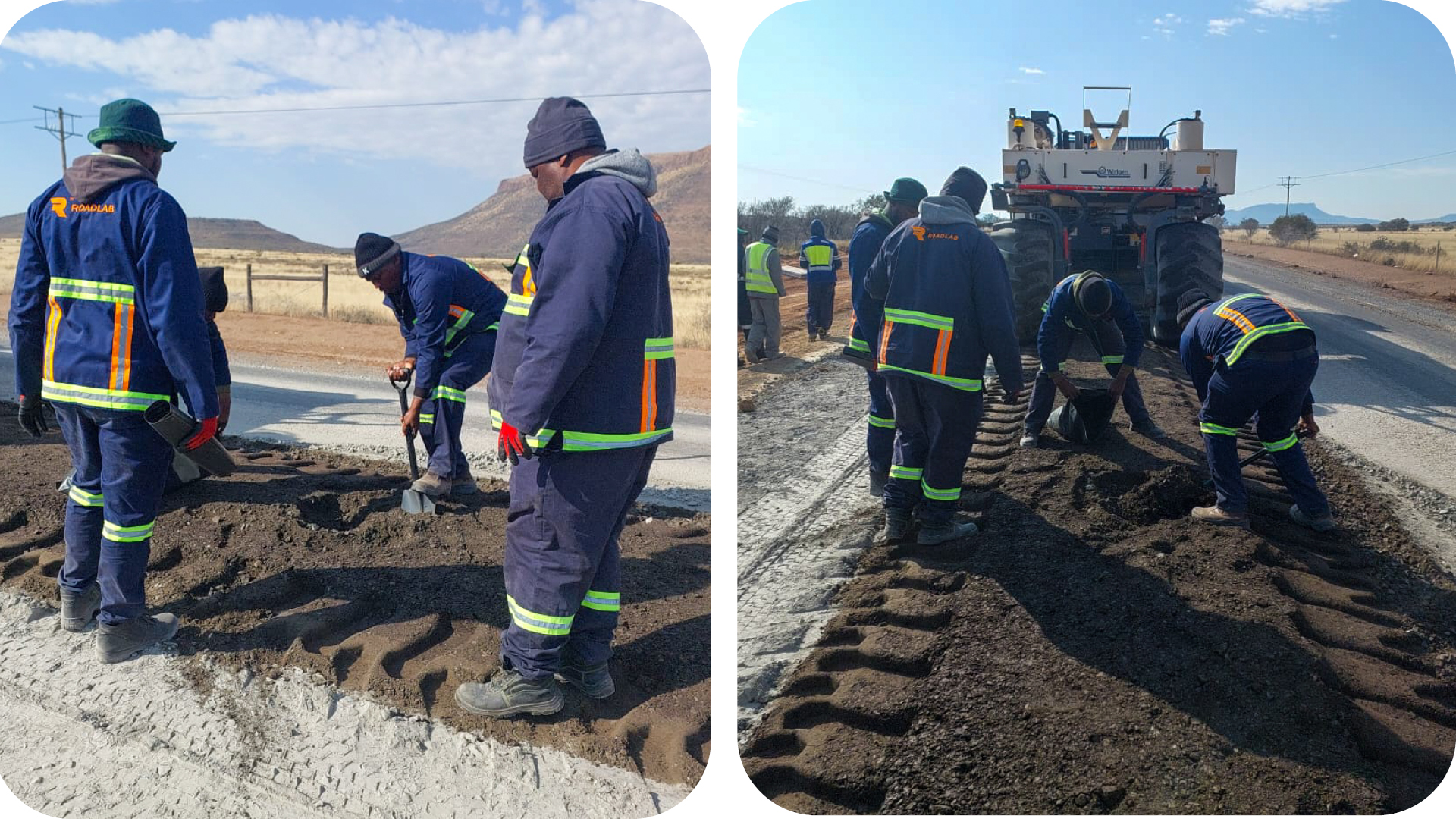The upgrade includes a Cape Seal surfacing with 20 mm aggregate and double slurry and a 150 mm bitumen-stabilised base (BSM) layer. The roadbed has been prepared to 93 % MDD, ensuring a strong and uniform foundation.